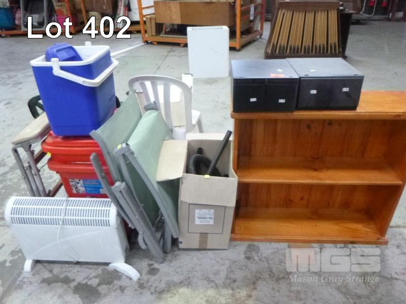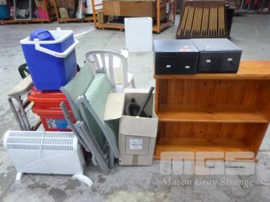 LOW LINE PINE BOOKCASE, OUT DOOR CHAIRS, WHEELIE BINS, ESKY, ETC