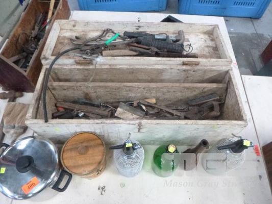 TIMBER TOOL BOX, HAND TOOLS, SODA SIPHONS, ETC