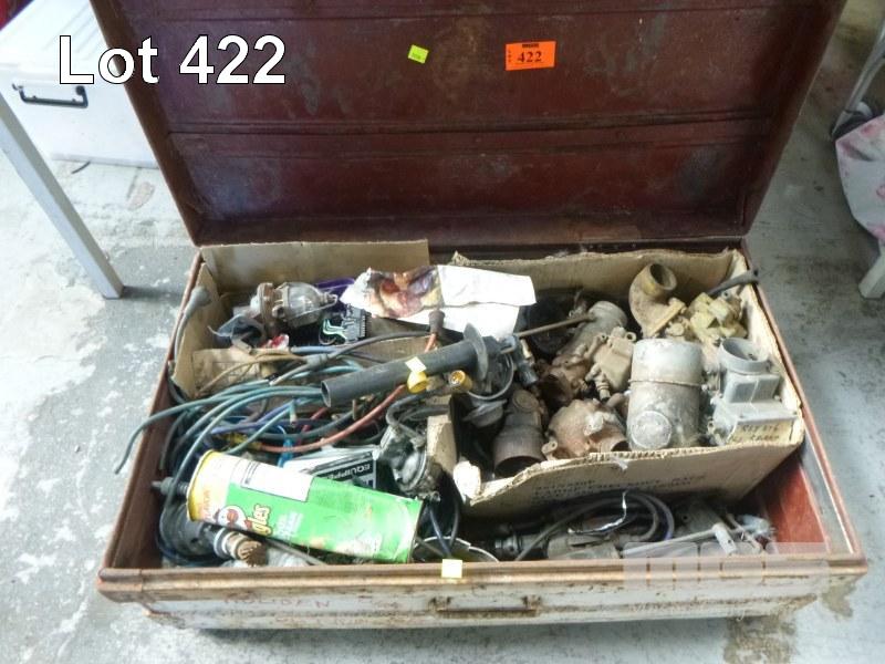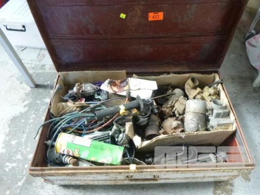 METAL TRUNK WITH ASSORTED EARLY AUTOMOTIVE PARTS