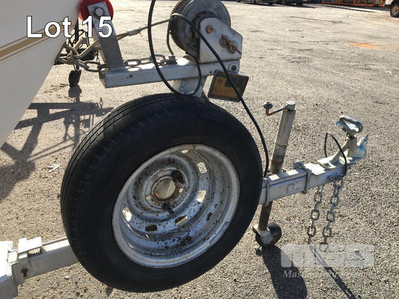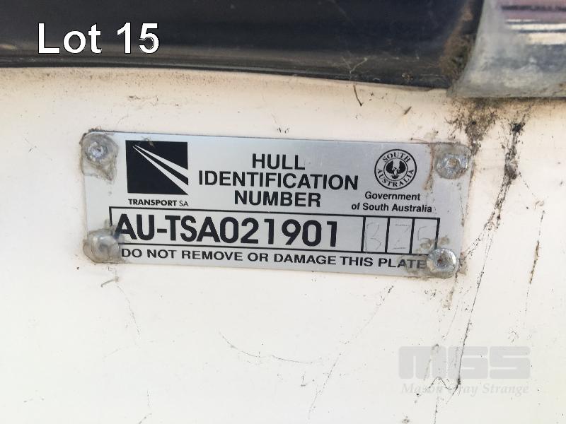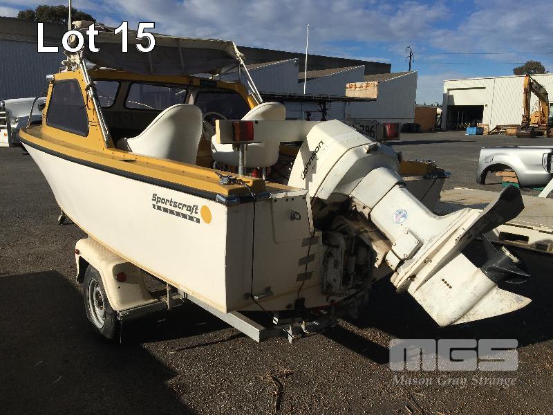 SPORTSCRAFT HUSTLER HALF CABIN BOAT 5m, FIBREGLASS HULL MARINE REG: NA92S HIN: AUTSA021901BZ5 FITTED WITH JOHNSON 90HP, V4 PETROL OUTBOARD ENGINE WHITE/YELLOW, CANOPY, ECHO SOUNDER, ON 1976 SINGLE AXLE TRAILER, TINKA REG: TLN 786 (SA) CHASSIS: 5170111 GVM: 750kg BALL HITCH, WINCH & SPARE WHEEL, WITH PAPERS