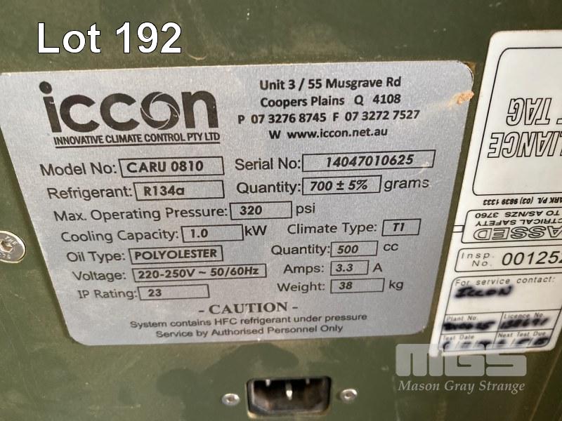 PORTABLE REFRIGERATION A/C UNIT, ICCON MOD: CARU0810 EX MILITARY SPEC 1kw COOLING R134A REFRIGERANT 240V WITH TRANSPORT CASE, GREEN POLY