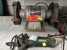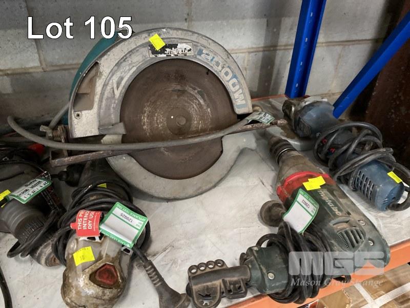 ASSORTED POWER TOOLS INC METABO ANGLE GRINDER & HAMMER DRILL, OZITO ANGLE GRINDER & HAMMER DRILL, BOSCH ANGLE GRINDER, MAKITA CIRCULAR SAW, 220mm & RYOBI BENCH GRINDER MOD: HBG634 150mm, 240V