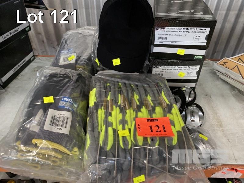 2 x BOXES (12/BOX) PROTECTIVE SAFETY GLASSES, MSA NULLARBOR NEX GEN MOD: 76943BLM BLUE MIRROR LENS, HC, UV400 & 24 x PAIRS PRO SENSE MAXI PRO GLOVES SIZE 7, 4 x UVEX PROTECTIVE SAFETY CAPS & 12 x PAIRS CONTEGO HI-VIS WORK GLOVES MECHANIC STYLE SIZE M, ETC