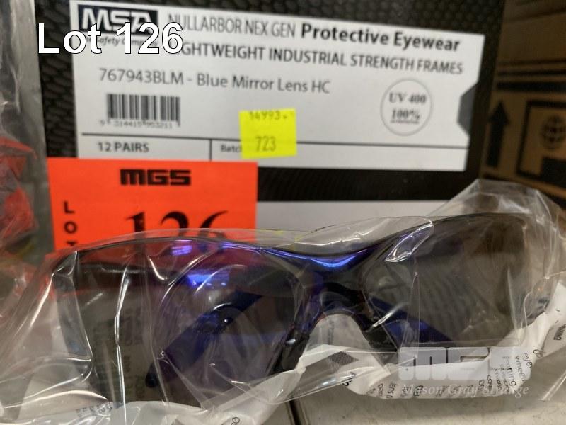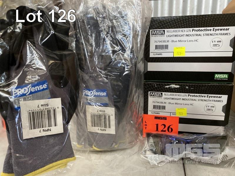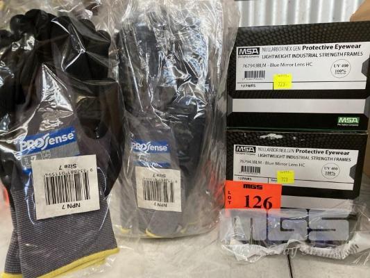 2 x BOXES (12/BOX) PROTECTIVE SAFETY GLASSES, MSA NULLARBOR NEX GEN MOD: 76943BLM BLUE MIRROR LENS, HC, UV400 & 12 x PAIRS PRO SENSE MAXI PRO GLOVES SIZE 7