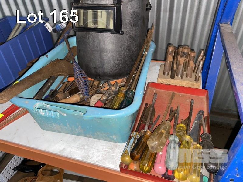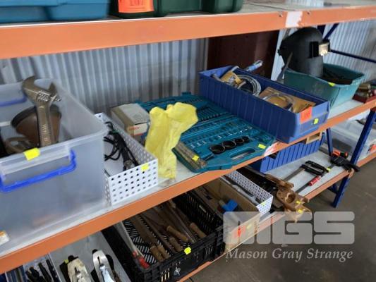 ASSORTED HAND TOOLS INC SHIFTERS, PIPE WRENCHES, PLIERS, CLAMPS, SCREWDRIVERS, PUNCHES, SOCKETS, SOLDERING IRONS, DRILL BIT & DRIVER SET, SPRING DRAIN CLEANERS, ETC 1 x SHELF