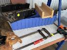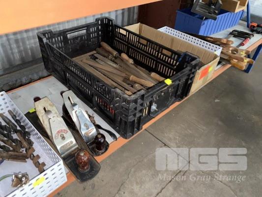 2 x HAND PLANES, POPE FALCON & TURNER, WOODWORKING DRILL BITS, FILES, HAND SAWS, SLIDING CLAMPS & MITRE BOXES 1 x SHELF