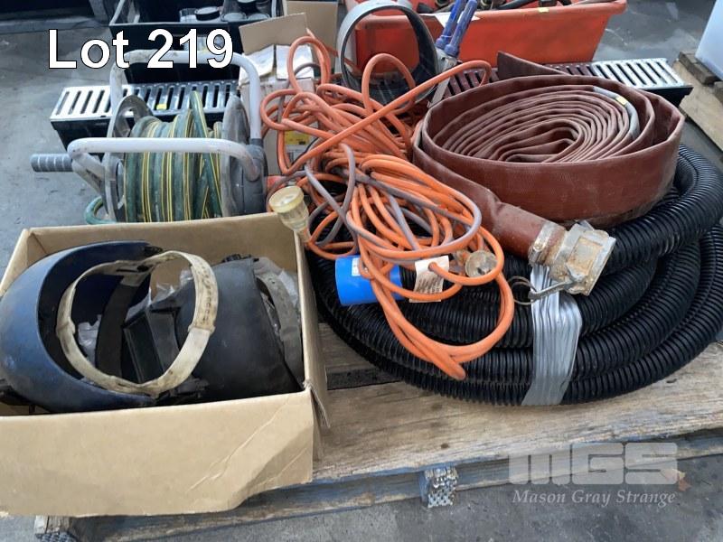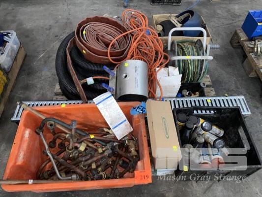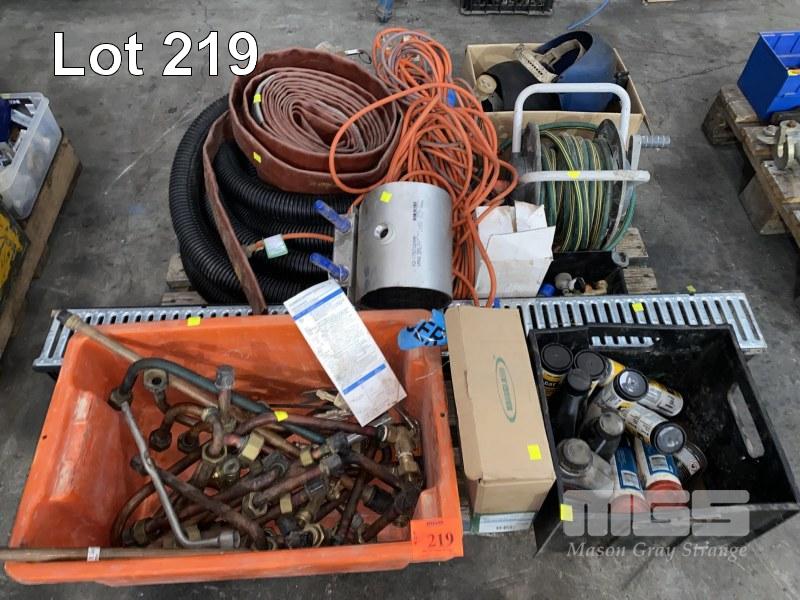 LAY FLAT HOSE, COPPER & BRASS FITTINGS, 240V EXTENSION CORD, HOSE REEL, ASSORTED GREASE & OIL, DRAINAGE CHANNEL & PIPE 1 x PALLET