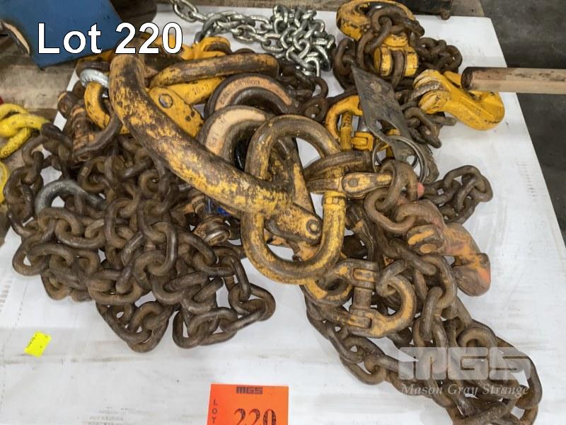 4 LEG LIFTING CHAIN, NOBLES 10mm CHAINS WITH HOOKS & SHORTENERS 4 TONNE, 2 x CHAIN DOGS, RATCHET TYPE 4 x SWIFT LIFTING ATTACHMENTS, 1.3 & 2.5T STAR DROPPER EXTRACTION TOOL, BALL & HITCH, ETC 1 x PALLET