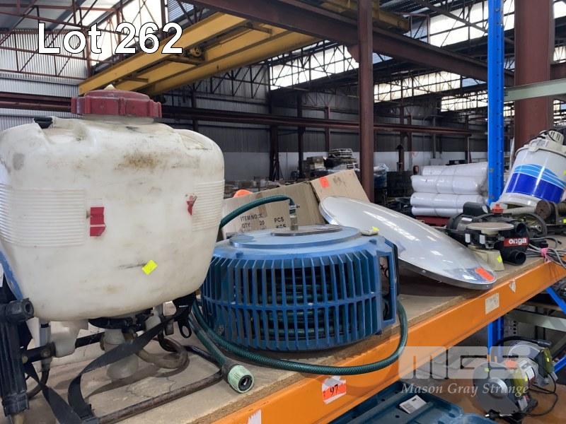 SPRAY PACK, RETRACTA HOSE REEL, DOME MIRROR, PUMP,SCALES, WOOD TURNING LATHE & VAC 1 x SHELF