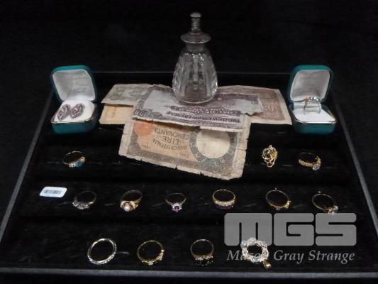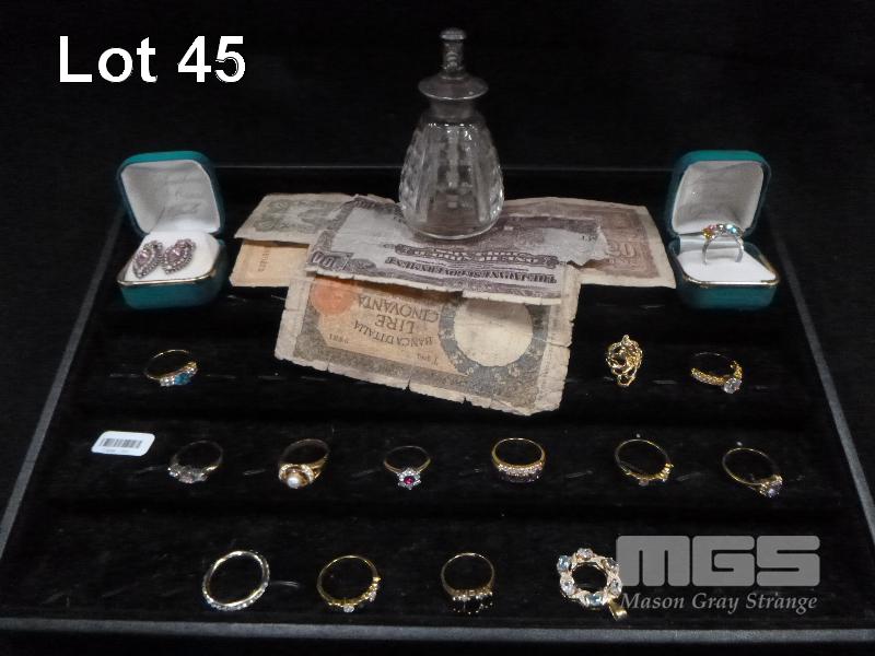 ASSORTED DRESS RINGS, WORLD BANK NOTES & PERFUME BOTTLE WITH STERLING SILVER TOP