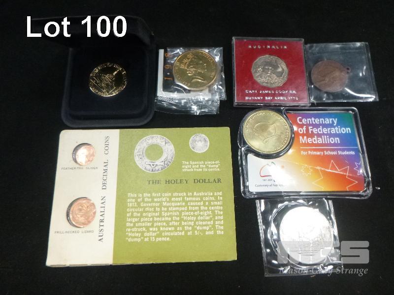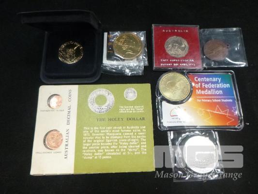 AUSTRALIA COMMEMORATIVE COINS, INC; 1998 $5 COIN, 1988 ROYAL VISIT MEDAL, 1988 EDUCATION MEDAL, 1970 50c CAPTAIN JAMES COOK, 1951 MEDAL, CENTENARY OF FEDERATION MEDAL, 1966 AUSTRALIAN DECIMAL COINS 1c & 2c SET