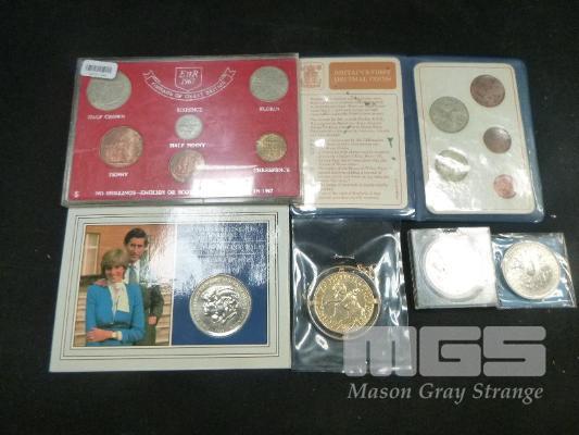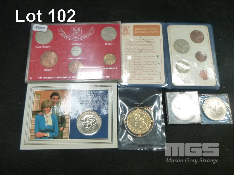 BRITISH COINAGE, INC; BRITAIN'S FIRST DECIMAL COINS, CASED 5 SHILLINGS, 1980 QUEEN MOTHER, PLATED 1977 25p, 1981 CHARLES & DIANA, 1967 COINAGE OF GREAT BRITAIN