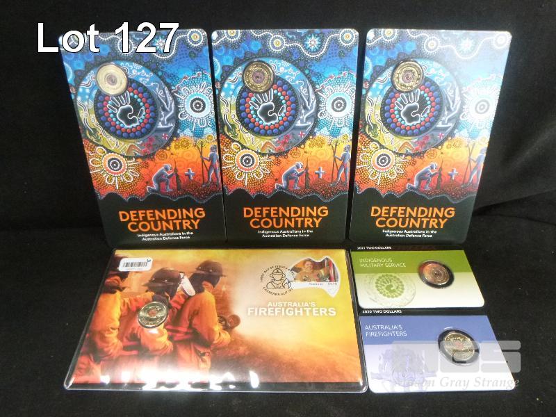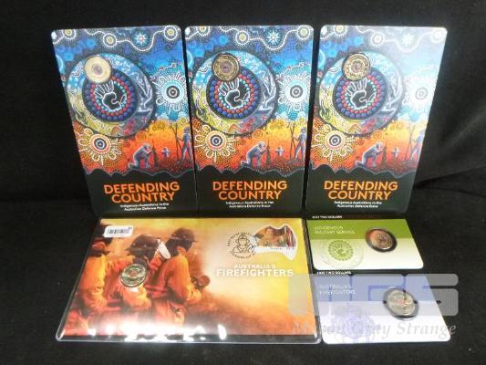 6 X AUSTRALIA, COMMEMORATIVE COIN PACKS, INC; 1 X 2021 $2 INDIGENOUS MILITARY SERVICE, 1 X 2020 $2 AUSTRALIA'S FIRE FIGHTERS, 3 X 2021 $2 DEFENDING COUNTRY, 1 X $2 COIN/ FIRST DAY COVER, AUSTRALIA'S FIRE FIGHTERS