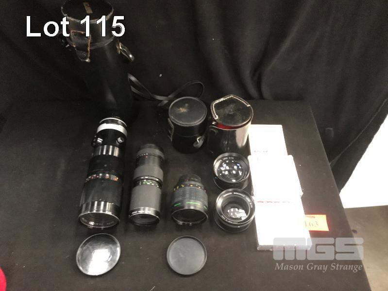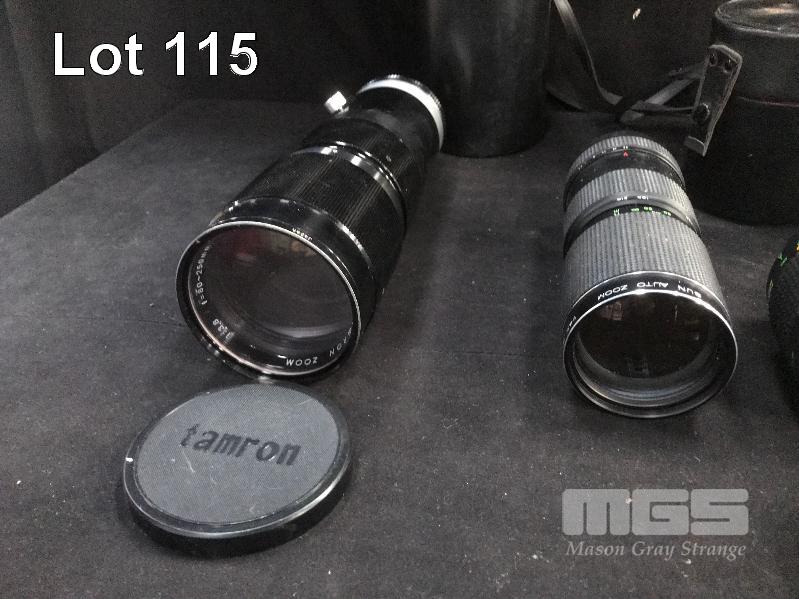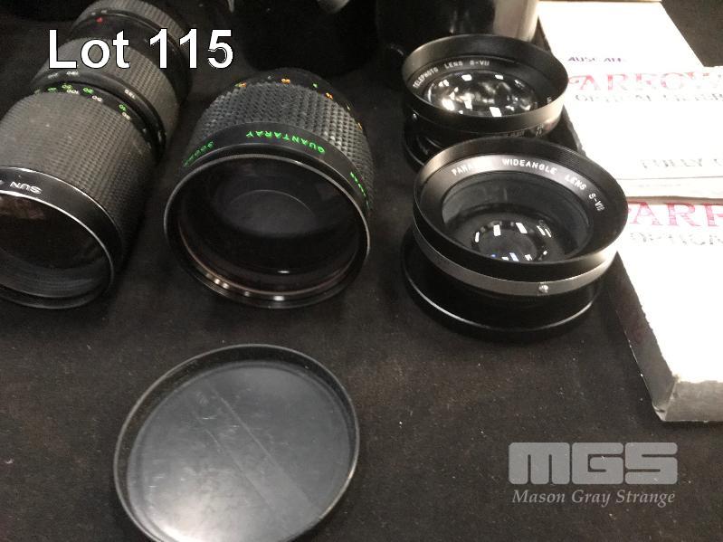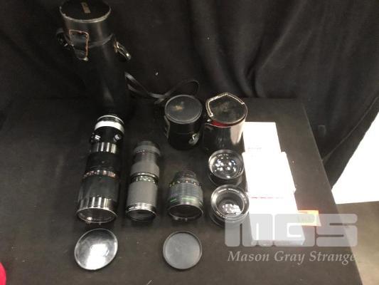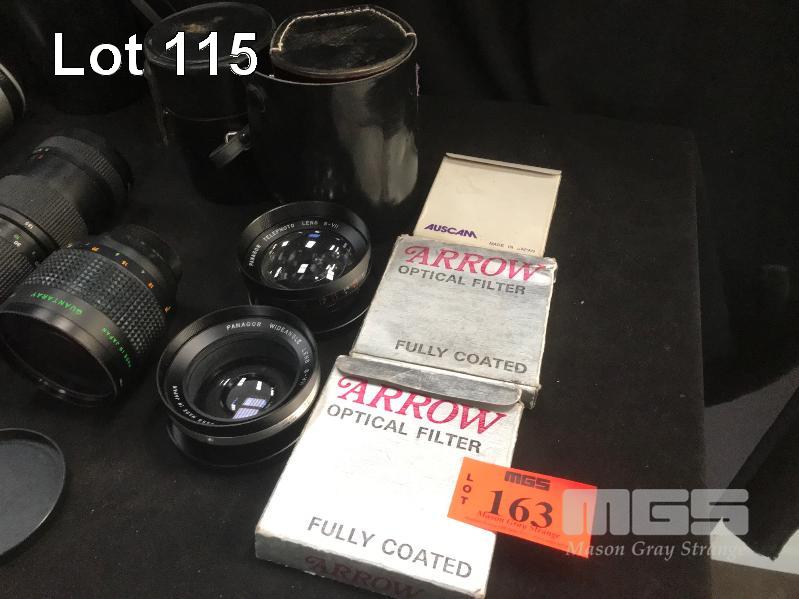 ASSORTED CAMERA ZOOM LENSES INC TAMARON ZOOM 1:3.8, F=80-250MM, P-CS WITH CASE SUN AUTO ZOOM, 1:45, 85-210MM 2 X PANAGOR LENSES, 1 X WIDEANGLE & TELEPHOTO S-VII QUANTARAY 1:5.6, 300MM MIRROR LENS & 3 X OPTICAL FILTERS 300MM
