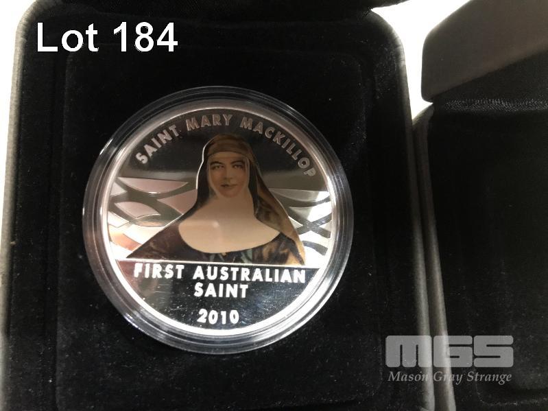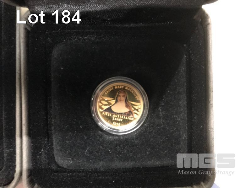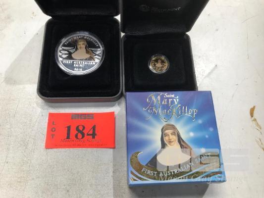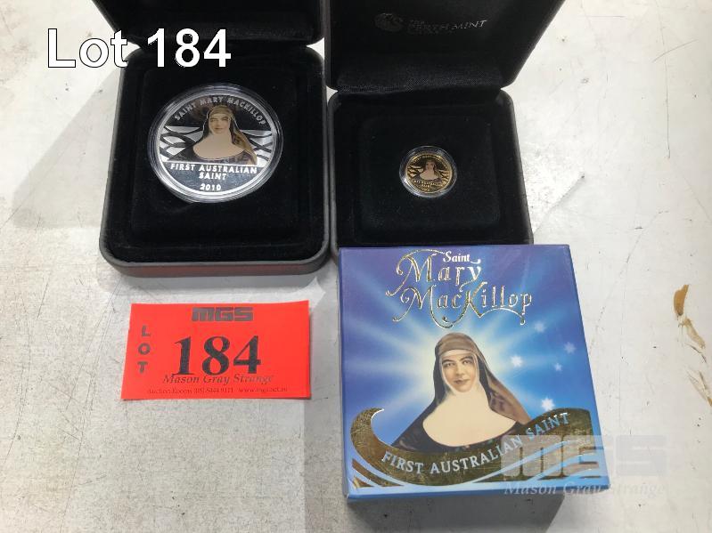 2 X MARY MACKILLOP COMMEMORATIVE COINS INC 2010 1/10TH OZ 0.999 GOLD COIN, 3.11 GRAMS, 24 CT, WITH DISPLAY & ORIGINAL BOX 2010 1 OZ, 99.99% SILVER PROOF COLOURED COIN ENCAPSULATED WITH DISPLAY BOX