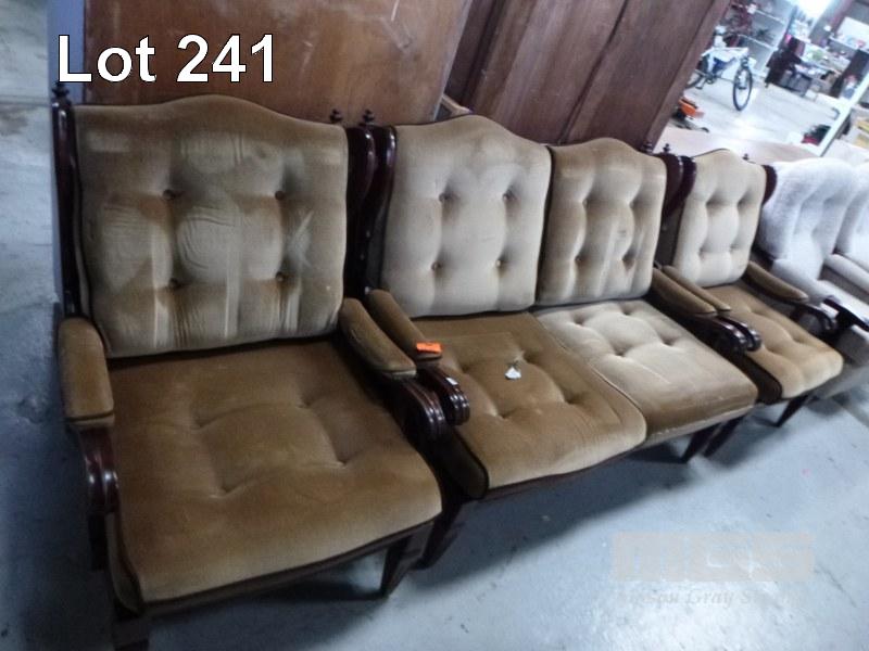 JACOBEAN 3 PIECE LOUNGE SUITE, GOLD VELVET CUSHIONS, TIMBER FRAME INC 2 SEATER & 2 x SINGLES