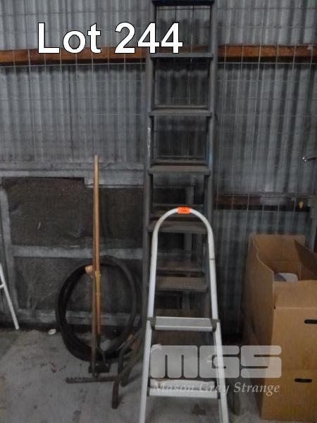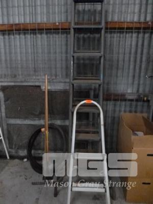 2 X METAL LADDERS, STEP LADDER & GARDEN TOOLS
