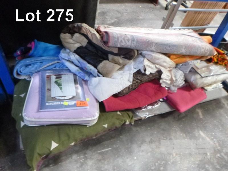 ASSORTED BEDDING, CURTAINS, RUG, ETC