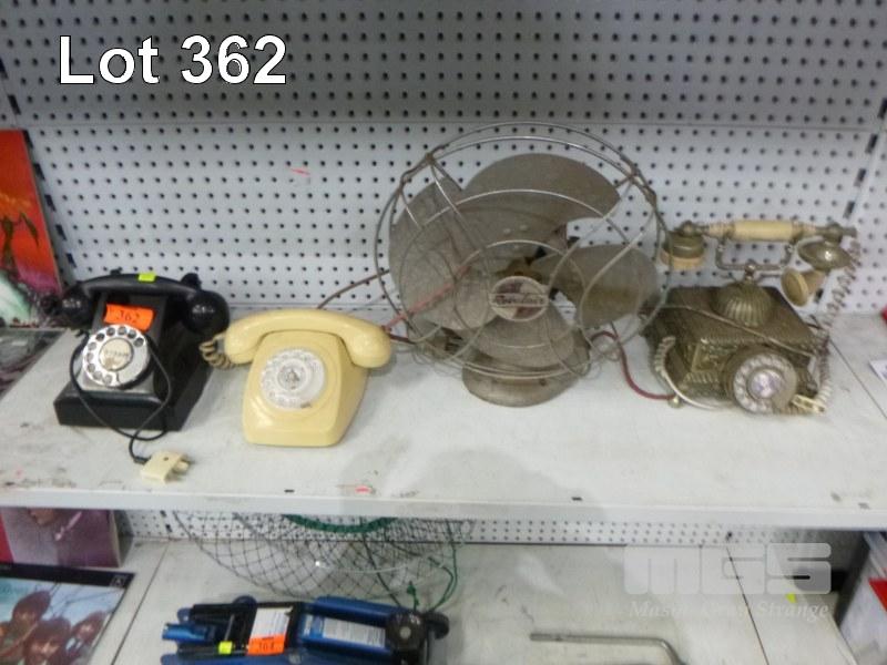 BLACK BAKELITE DIAL TELEPHONE, RETRO DIAL TELEPHONE, ANTIQUE LOOK DIAL TELEPHONE & REVELAIR DESKTOP FAN