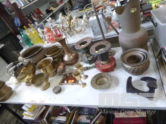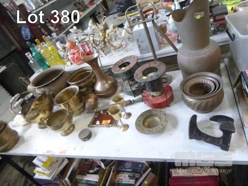 ASSORTED COPPER & BRASSWARE, BOOT LASAT & VINTAGE CAMPING STOVES, 1 x TABLE