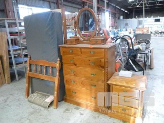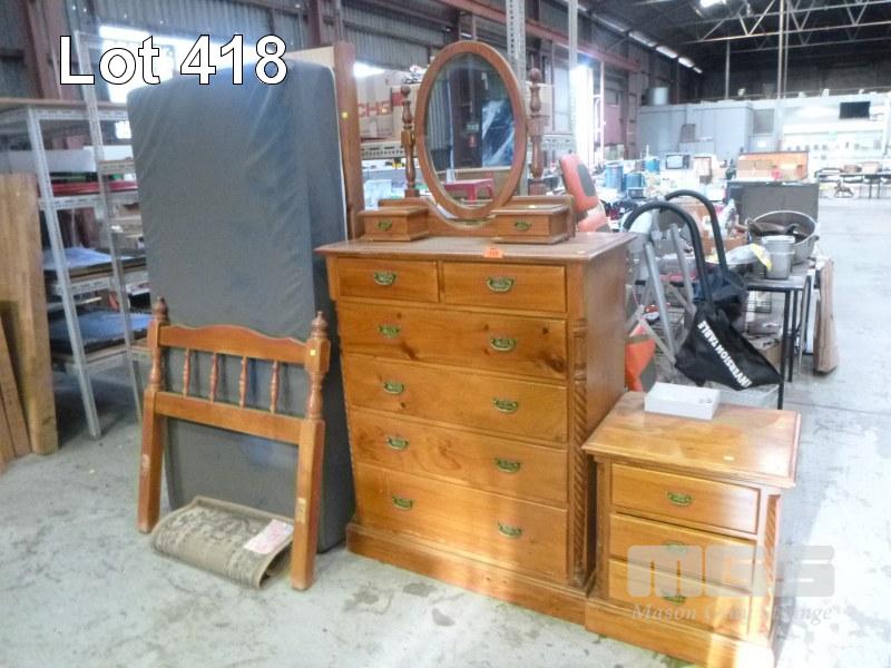 PINE 4 PIECE BEDROOM SUITE, INC; TALLBOY, VANITY MIRROR, BEDSIDE CABINET & SINGLE BED