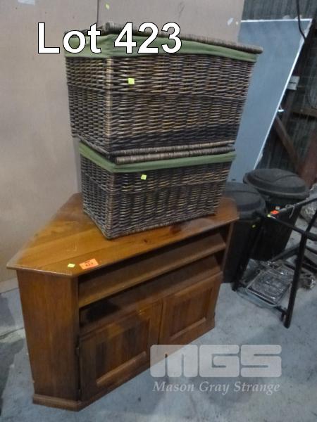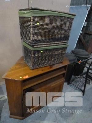 2 X WHICKER BASKETS & PINE, CORNER ENTERTAINMENT UNIT