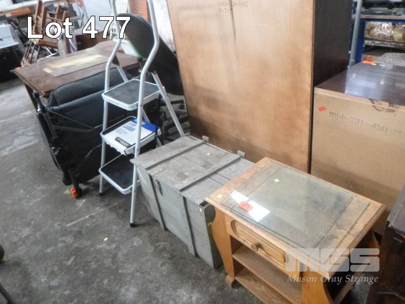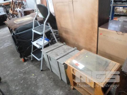 OUTDOOR LOUNGE CHAIR, STEP LADDER, TIMBER CRATE & BEDSIDE CABINET