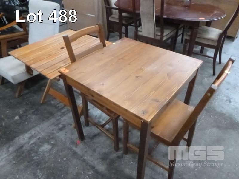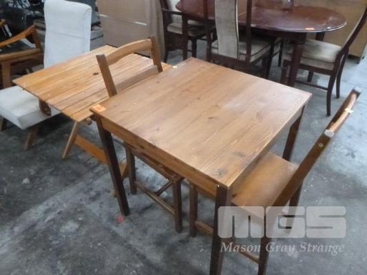 PINE 3 PIECE DINING SUITE INC SQUARE TABLE & 2 x CHAIRS, WITH FOLD UP TIMBER SLAT PATIO TABLE