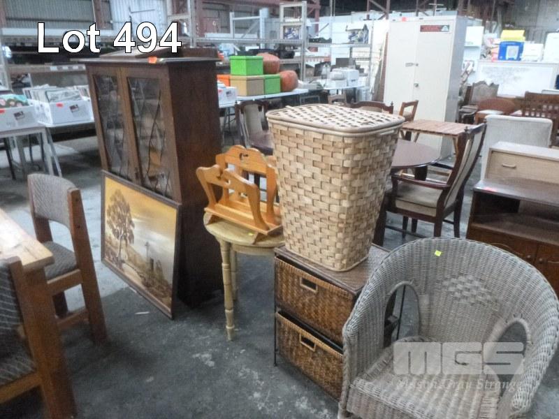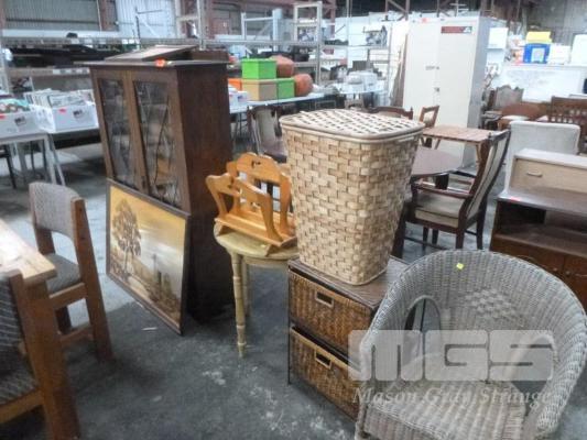 TIMBER DISPLAY CABINET (1 X LEAD LIGHT DOOR BROKEN), WICKER ARMCHAIR, HALL TABLE, MAGAZINE RACK, PAINTINGS, ETC