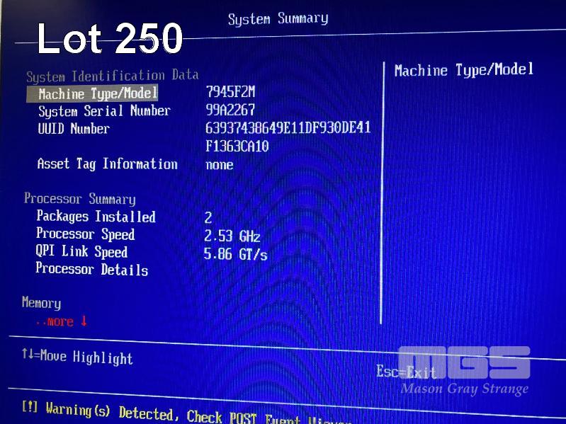 RACKMOUNT SERVER, IBM SYSTEM x3650 M3 (7945F2M), 2U, 2 x XEON E5630 @ 2.53GHz, 48GB ECC DDR3 RAM, 2 x 146GB SAS HDD, DVD-RW, 2 x FIBRE CHANNEL, 2 x PSU (NOTE: WARNINGS DETECTED MESSAGE) (NO CABLES) S/N:99A2267
