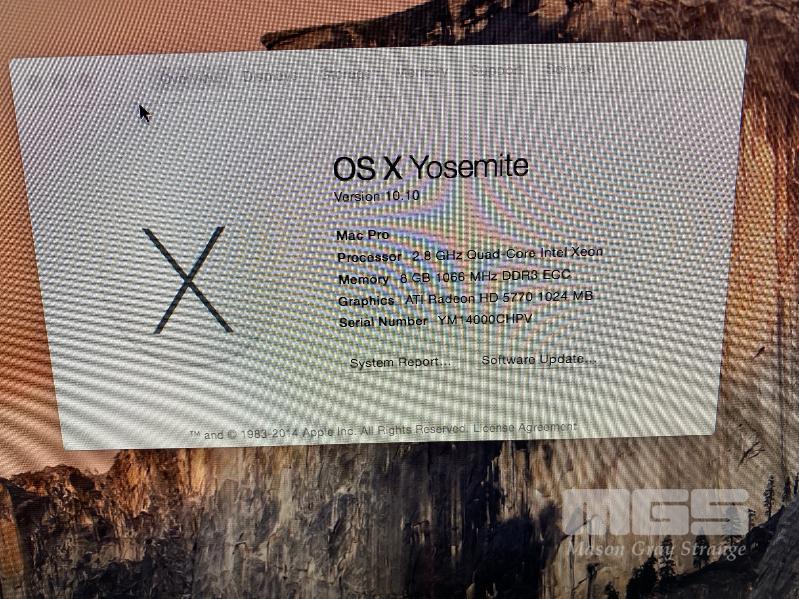 APPLE MAC PRO (A1289) TOWER, XEON W3530 @ 2.8GHz, 8GB ECC DDR3 RAM, 1TB SATA HDD, DVD-RW, 1GB ATI RADEON HD 5770 VIDEO, FIBRE CHANNEL, MAC OS 10.10 INSTALLED (NO KEYBOARD, NO MOUSE, NO CABLE) S/N:YM14000CHPV