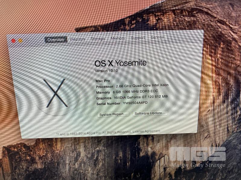 APPLE MAC PRO (A1289) TOWER, XEON W3520 @ 2.66GHz, 6GB ECC DDR3 RAM, 640GB SATA HDD, DVD-RW, 512MB NVIDIA GEFORCE GT 120 VIDEO, MAC OS 10.10 INSTALLED (NO KEYBOARD, NO MOUSE, NO CABLE) S/N:YM92504A4PD