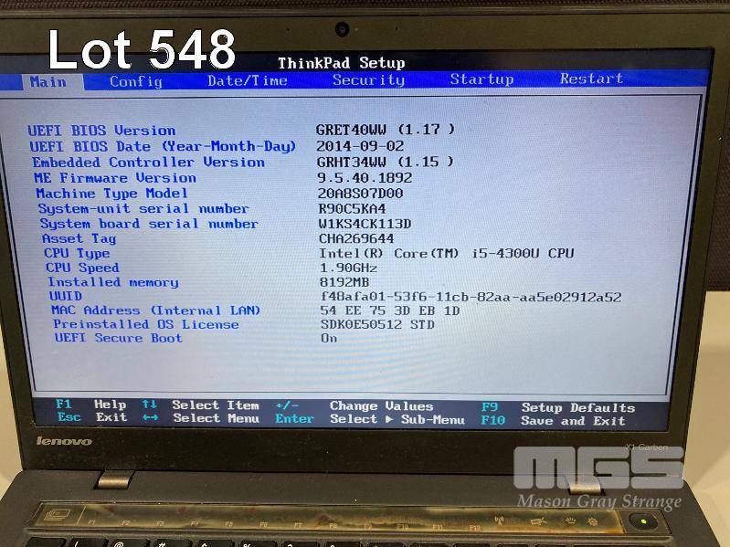 LAPTOP, LENOVO THINKPAD X1 CARBON (20A8S07D00), CORE i5 4300U (4TH GEN) @ 1.9GHz, 8GB DDR3 RAM, 128GB SSD, 14" WIDESCREEN (1600x900), INTEL HD VIDEO, Wi-Fi, BLUETOOTH, WINDOWS 10 HOME INSTALLED & POWER SUPPLY S/N:R90C5KA4