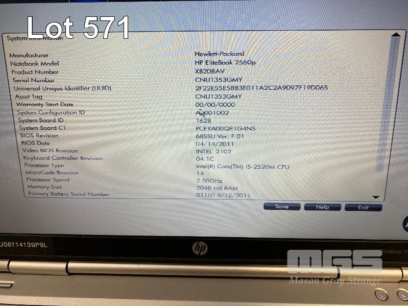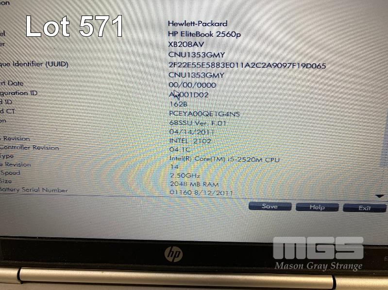 LAPTOP, HP ELITEBOOK 2560p (XB208AV), CORE i5 2520M (2ND GEN) @ 2.5GHz, 2GB DDR3 RAM, 250GB SATA HDD, DVD-RW, 12.5" WIDESCREEN (1366x768), INTEL HD VIDEO, Wi-Fi, BLUETOOTH, WINDOWS 7 PRO INSTALLED W/ LICENSE & POWER SUPPLY (NOTE: BATTERY NOT CHARGING) S/N:CNU1353GMY