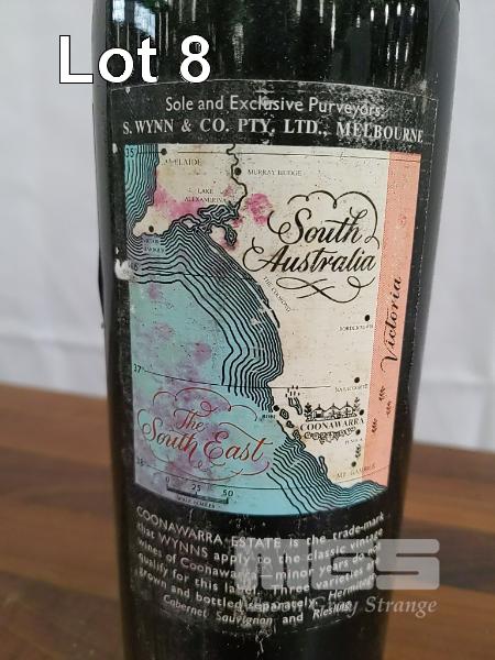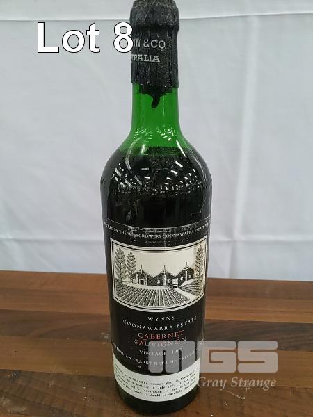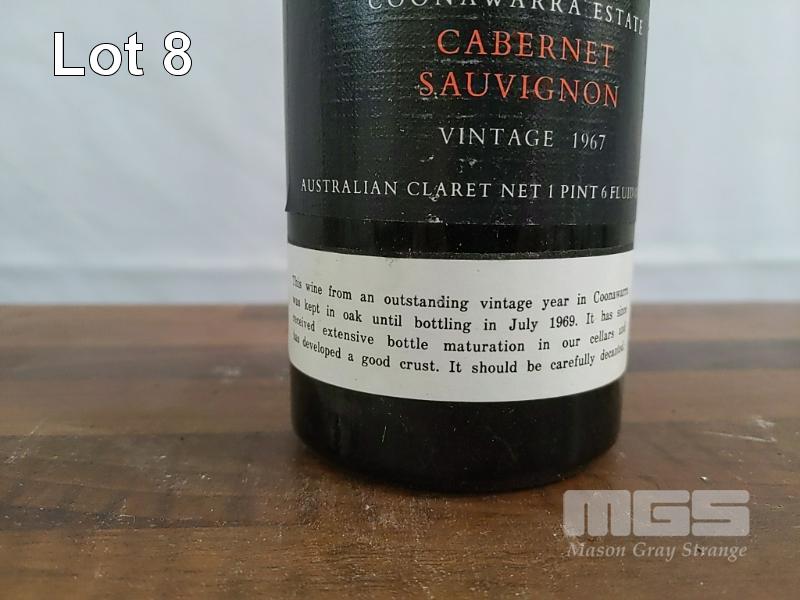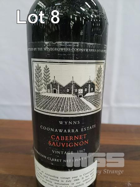 1967 WYNNS COONAWARRA ESTATE CABERNET SAUVIGNON. SINGLE "NET 1 PINT 6 FLUID OUNCES" BOTTLE, UNDER CORK. FILL LEVEL "TOP SHOULDER". CAPSULE FAIR. BOTTLE GOOD. LABELS FAIR TO AVERAGE.