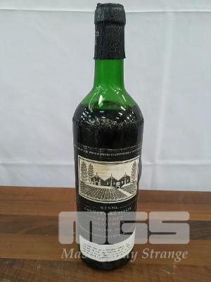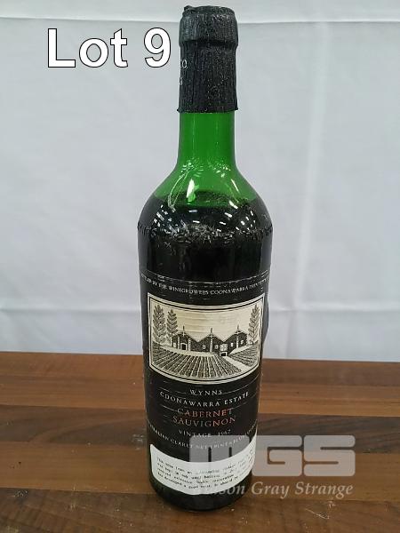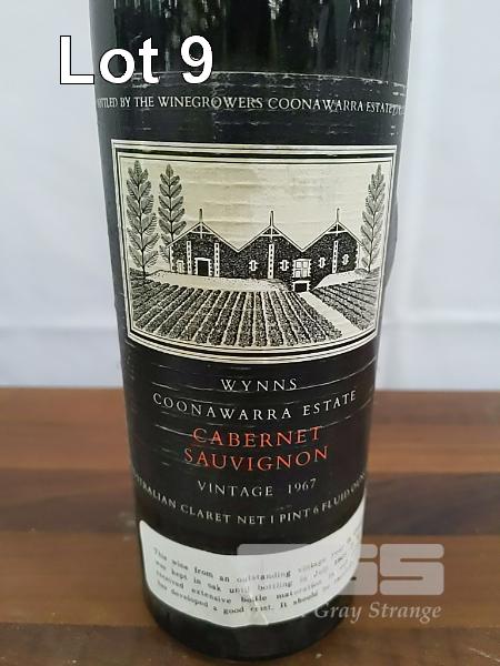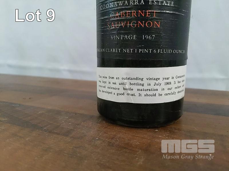 1967 WYNNS COONAWARRA ESTATE CABERNET SAUVIGNON. SINGLE "NET 1 PINT 6 FLUID OUNCES" BOTTLE, UNDER CORK. FILL LEVEL "MID SHOULDER". CAPSULE AVERAGE. EVIDENT SEEPAGE. BOTTLE GOOD. LABELS FAIR TO AVERAGE.
