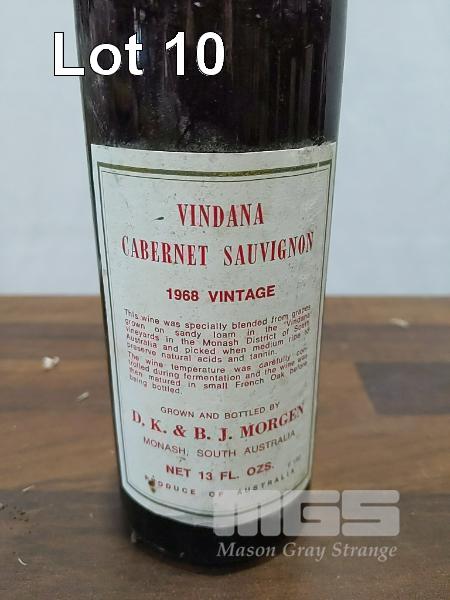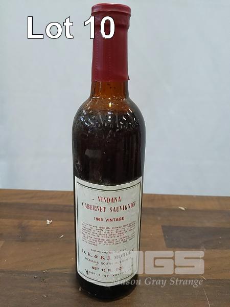 1968 VINDANA CABERNET SAUVIGNON. SINGLE "NET 13 GL. OZS." CLARET HALF BOTTLE, UNDER CORK. * VINDANA VINEYARDS MONASH * * D.K. & B.J. MORGEN * FILL LEVEL "MID-SHOULDER". CAPSULE SOUND. BOTTLE & LABEL GOOD.