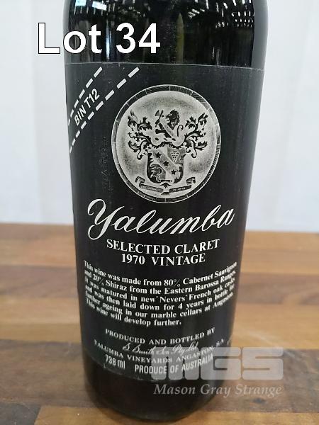 1970 YALAMBA "SELECTED CLARET" - BIN T12. SINGLE 738ML CLARET BOTTLE, UNDER CORK. * EASTERN BAROSSA RANGES * * 80% CABERNET SAUVIGNON 20% SHIRAZ * FILL LEVEL "MID-SHOULDER". CAPSULE AVERAGE, TOP IS OFF AND SOME CRUST. BOTTLE AND LABEL FAIR.