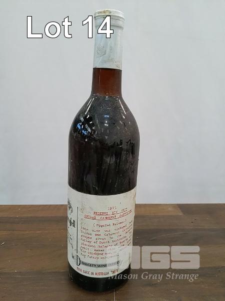 1971 STONYFELL (SPECIAL RELEASE) RESERVE BIN SV/7 BAROSSA SHIRAZ CABERNET SAUVIGNON. SINGLE 738ML CLARET BOTTLE, UNDER CORK. FILL LEVEL " BASE OF NECK". CAPSULE SOUND. BOTTLE & LABEL FAIR TO GOOD.