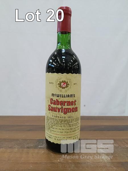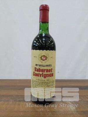 1971 MCWILLIAMS CABERNET SAUVIGNON. SINGLE 750ML CLARET BOTTLE, UNDER CORK. FILL LEVEL "VERY TOP-SHOULDER". PLASTIC CAP GOOD. BOTTLE & LABEL GOOD.