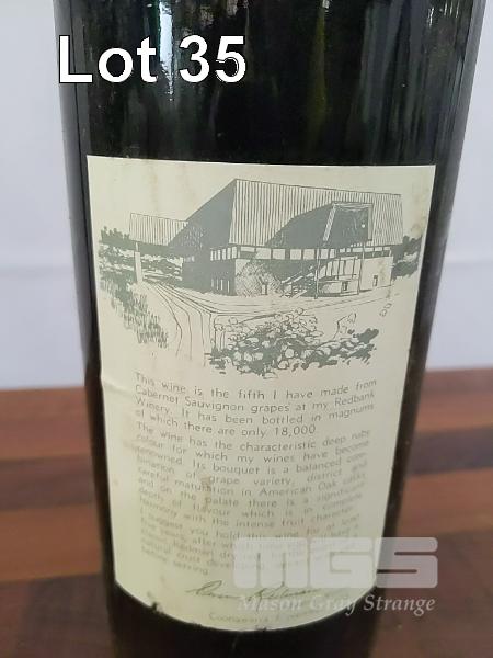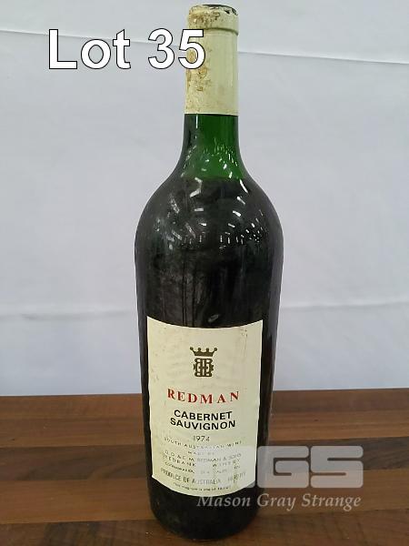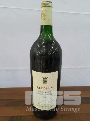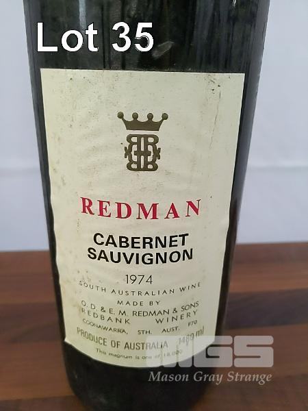 1974 REDMAN COONAWARRA CABERNET SAUVIGNON. SINGLE "1480 ml" MAGNUM, UNDER CORK. FILL LEVEL "TOP SHOULDER". TOP IS OFF CAPSULE. SOME SEEPAGE EVIDENT. BOTTLE GRIMY. LABELS AVERAGE.