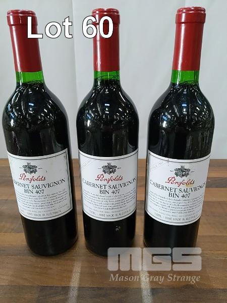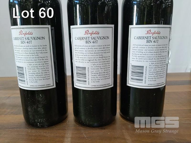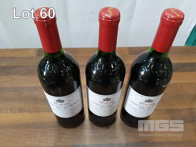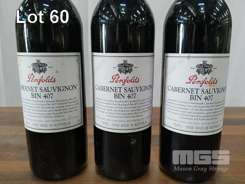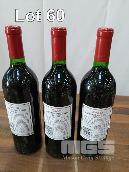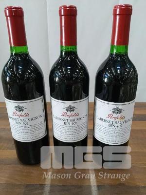 1993 PENFOLDS BIN 407 CABERNET SAUVIGNON 3 x 750ML CLARET BOTTLES UNDER CORK. FILL LEVELS "VERY TOP SHOULDER" TO "IN NECK" CAPSULES IN GOOD CONDITION. BOTTLES HAVE SUPERFICIAL CELLARING DUST. SCUFF MARK ON ONE FRONT LABEL EDGE TORN ON ONE BACK LABEL.