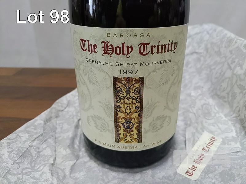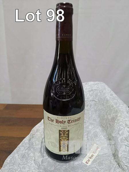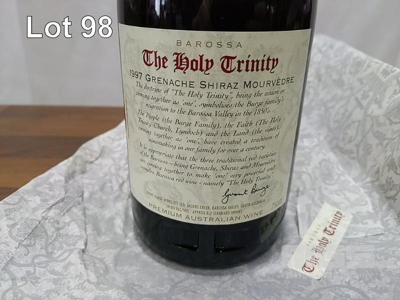 1997 GRANT BURGE "THE HOLY TRINITY" BAROSSA GRENACHE SHIRAZ MOURVEDRE. SINGLE 750ML BURGUNDY BOTTLE, UNDER CORK. FILL LEVEL "1 CM". CAPSULE GOOD. BOTTLE & LABELS EXCELLENT.