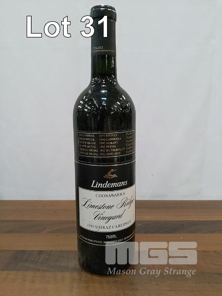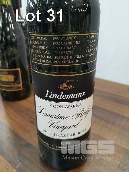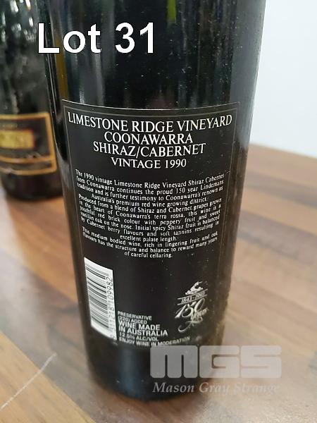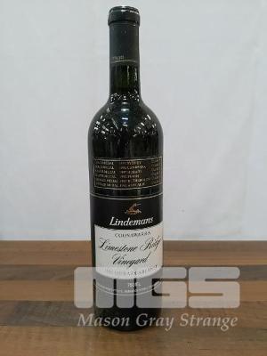 1990 LINDEMANS "LIMESTONE RIDGE VINEYARD" SHIRAZ CABERNET. SINGLE 750ML CLARET BOTTLE, UNDER CORK. FILL LEVEL "IN NECK". CAPSULE SOUND, SCRAPES ON RIM. BOTTLE & LABELS AVERAGE TO GOOD.