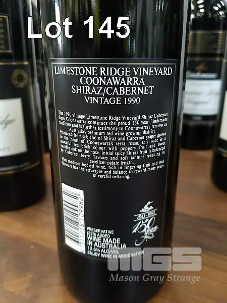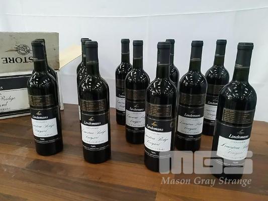 1990 LINDEMANS "LIMESTONE RIDGE VINEYARD" SHIRAZ CABERNET. CASE OF 12 X 750ML CLARET BOTTLES , UNDER CORK. FILL LEVELS "BASE OF NECK" WITH ONE AT "MID SHOULDER" AND ONE AT "TOP SHOULDER". CAPSULES FAIR TO GOOD WHERE NO SEEPAGE. SEEPAGE ON THREE. BOX FAIR. BOTTLES & LABELS GOOD.