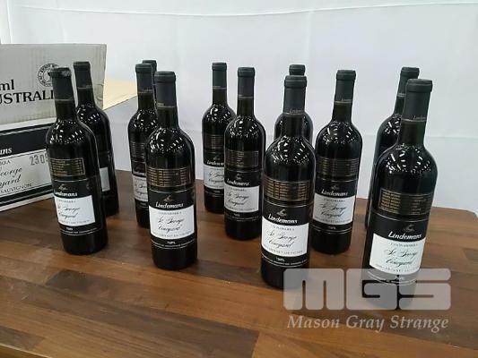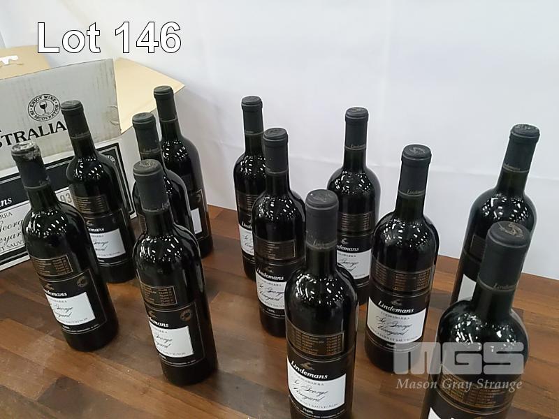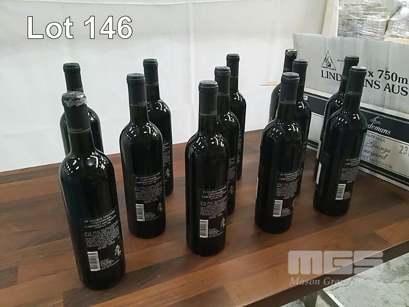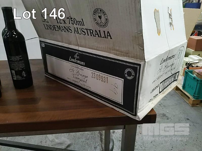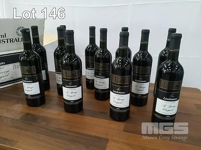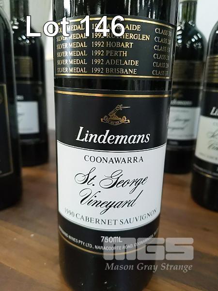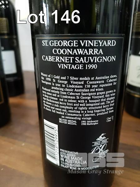 1990 LINDEMANS "ST GEORGE VINEYARD" CABERNET SAUVIGNON. CASE OF 12 X 750ML CLARET BOTTLES , UNDER CORK. FILL LEVELS "IN NECK" WITH ONE AT "TOP SHOULDER" AND ONE AT "VERY TOP SHOULDER". CAPSULES FAIR TO GOOD WHERE NO SEEPAGE. SEEPAGE ON FOUR. BOX FAIR. BOTTLES & LABELS GOOD.