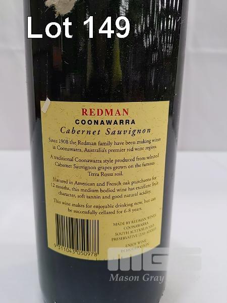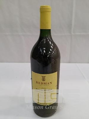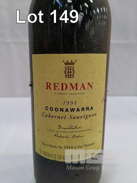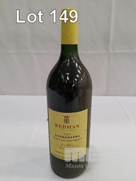 1991 REDMAN COONAWARRA CABERNET SAUVIGNON SINGLE 1.5L MAGNUM, UNDER CORK. FILL LEVEL "IN NECK". CAPSULE GOOD. CELLAR DUST ON BOTTLE AND LABELS, OTHERWISE GOOD.