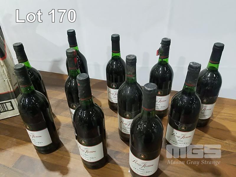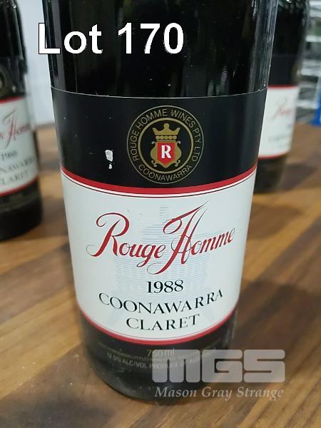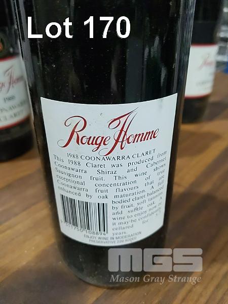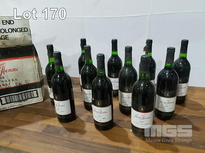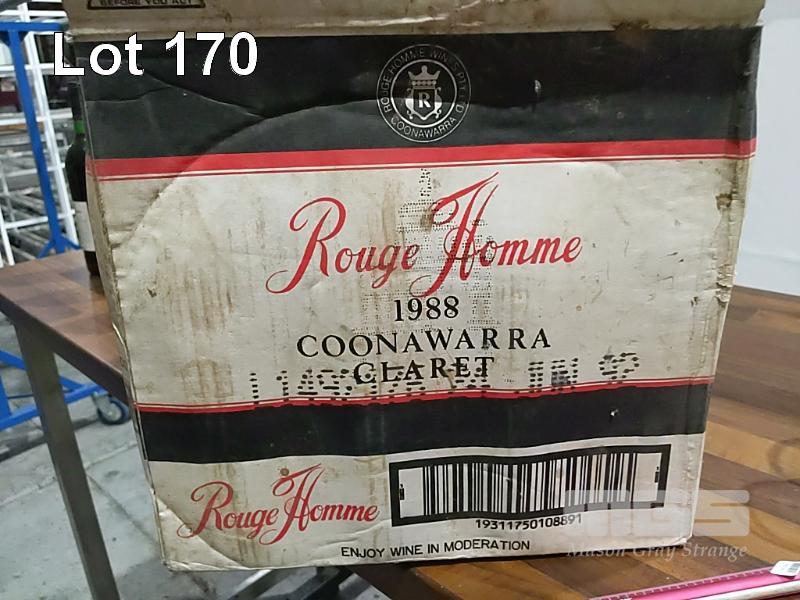 1998 ROUGE HOMME COONAWARA CLARET. CASE OF 11 X 750ML CLARET BOTTLES, UNDER CORK. FILL LEVELS "VERY TOP SHOULDER" TO "BASE OF NECK". CAPSULES POOR. BOX POOR. BOTTLES FAIR. LABELS POOR.