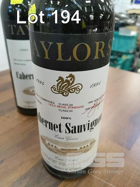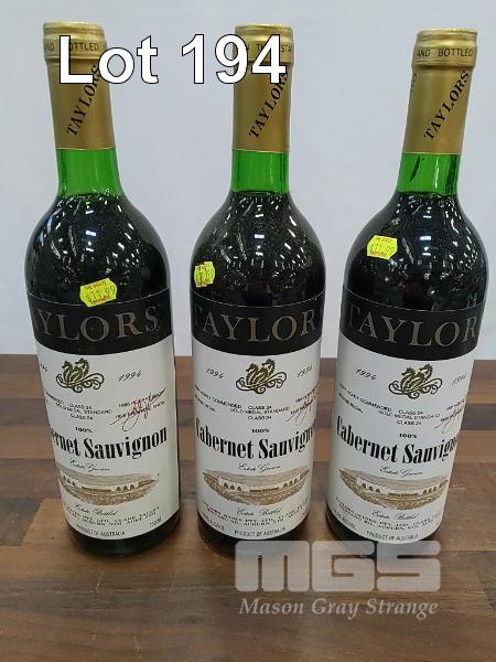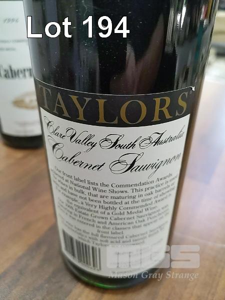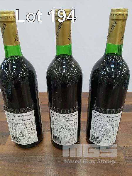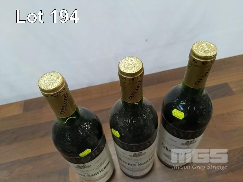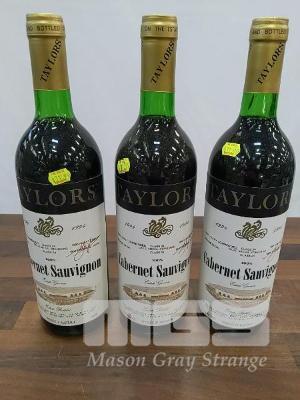 1994 TAYLORS CLARE VALLEY CABERNET SAUVIGNON. 3 X 750ML CLARET BOTTLES, UNDER CORK. FILL LEVELS TWO "IN NECK". ONE "VERY TOP SHOULDER". CAPSULES GOOD. BOTTLES GOOD. LABELS FAIR, ONE BOTTLE WITH LABELS LIFTING.