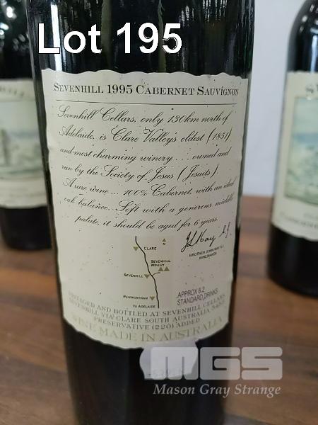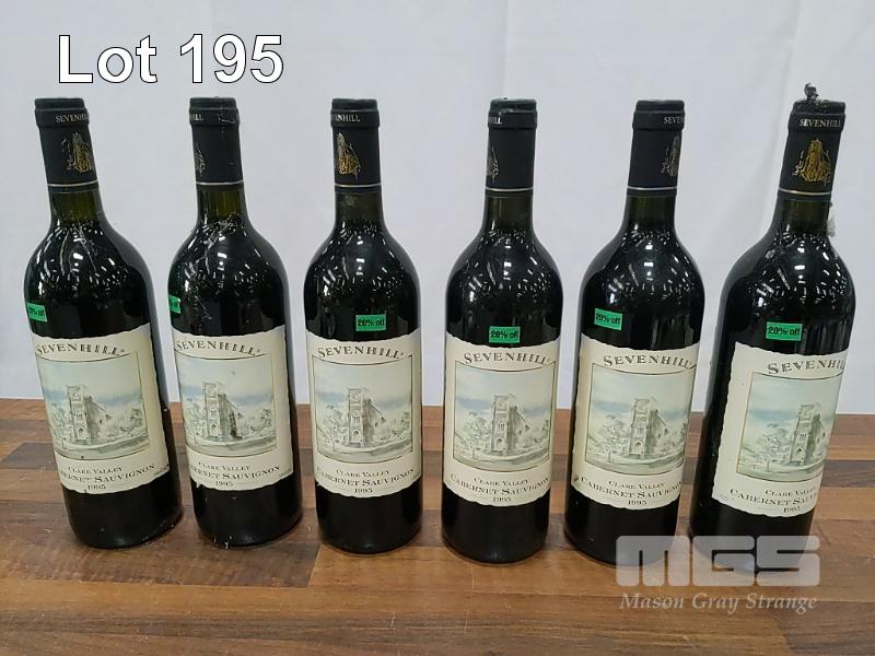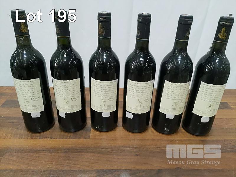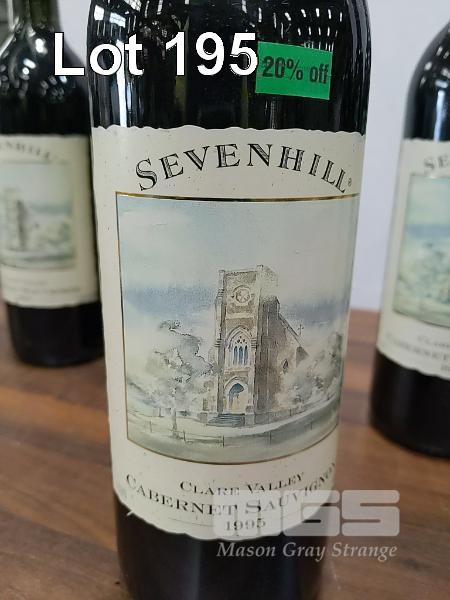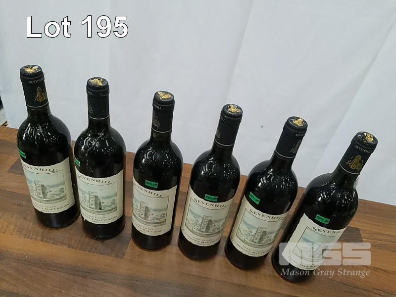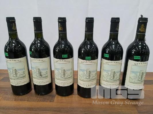 1995 SEVENHILL CLARE VALLEY CABERNET SAUVIGNON. 6 X 750ML CLARET BOTTLES, UNDER CORK. FILL LEVELS "BASE OF NECK". CAPSULES GOOD TO AVERAGE. ONE DAMAGED ON TOP, THREE PERFORATED. BOTTLES & LABELS FAIR TO AVERAGE.